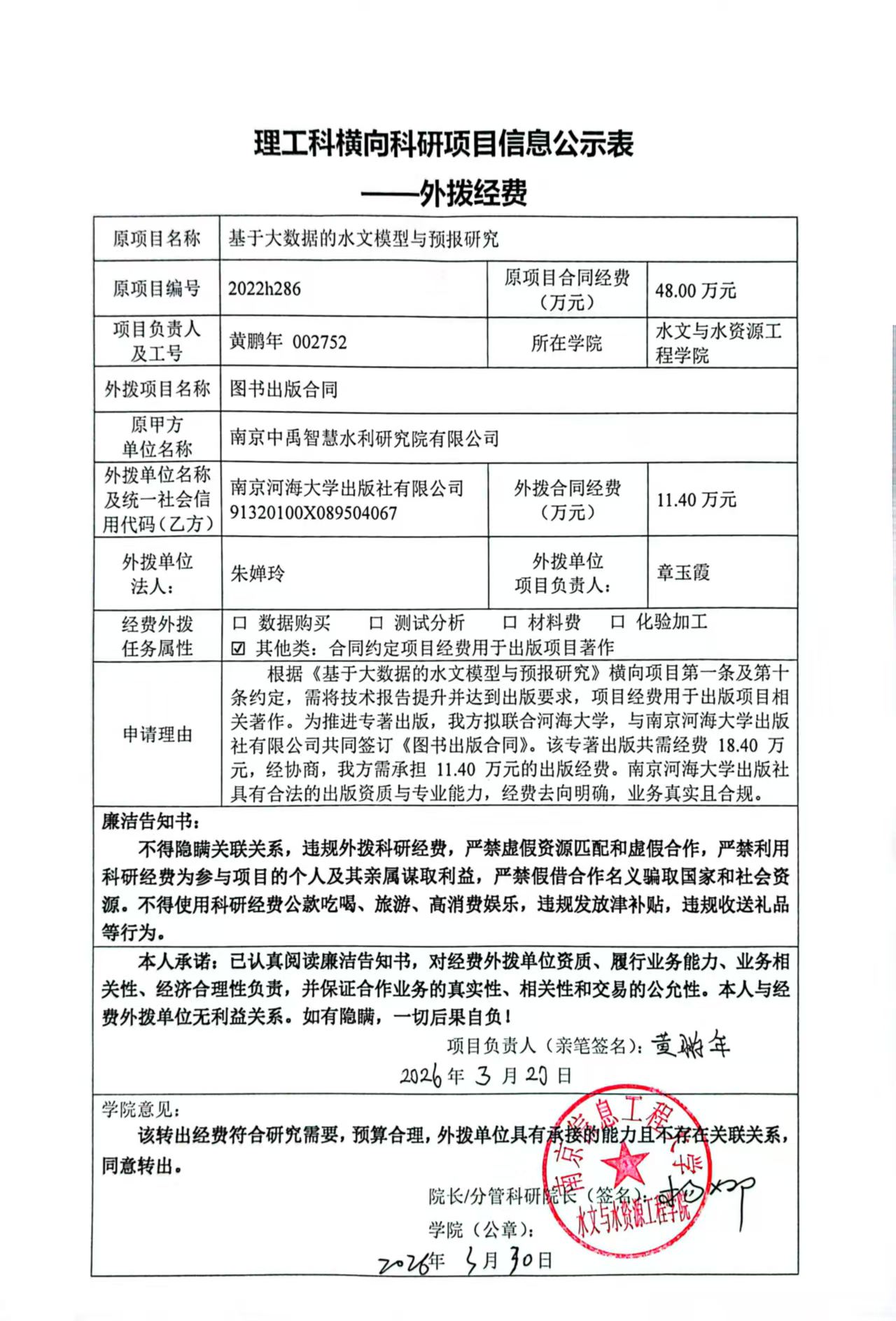 根据我校科研项目外拨经费管理要求,理工类横向项目外拨须进行公示,公示期5个工作日。现对我校拟外拨横向项目有关事项公示如下: