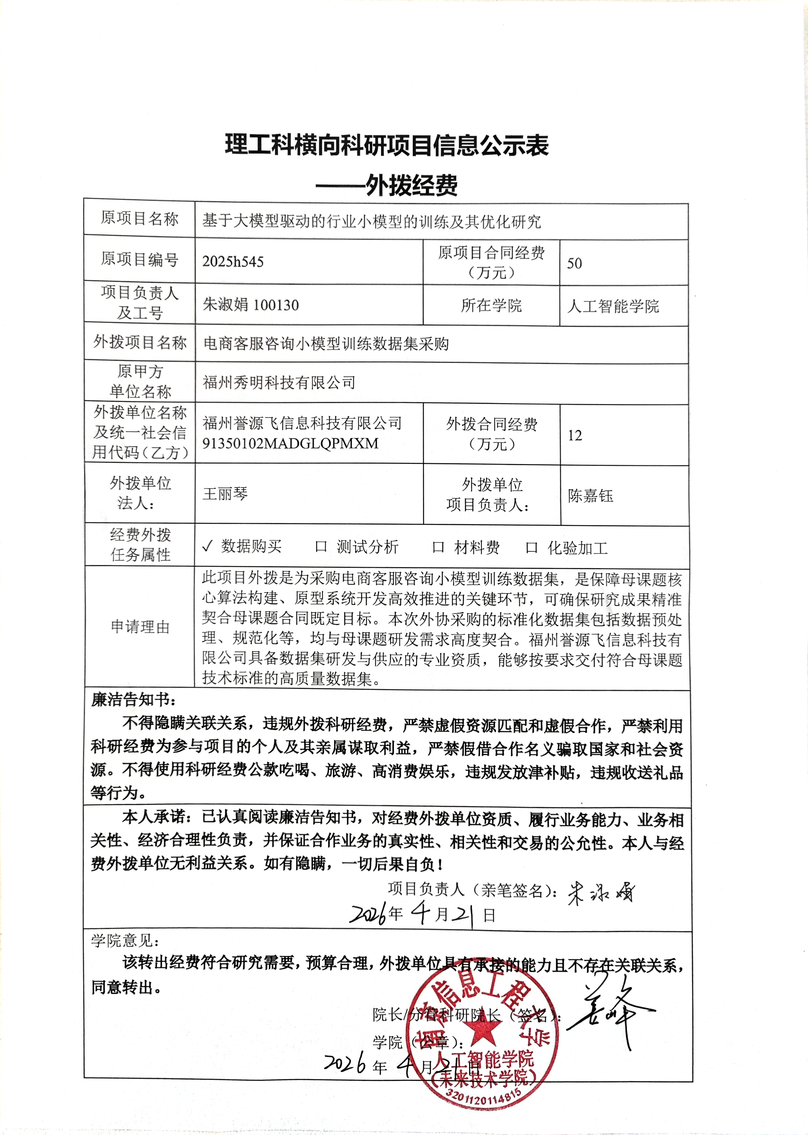 根据我校科研项目外拨经费管理要求,理工类横向项目外拨须进行公示,公示期5个工作日。现对我校拟外拨横向项目有关事项公示如下: